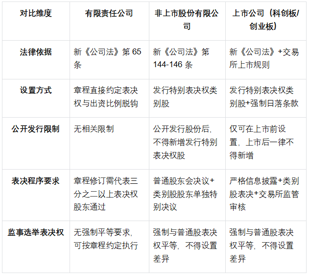 新《公司法》对有限责任公司、股份有限公司的同股不同权设置,采取差异化准入标准,有限公司更侧重意思自治,股份公司(尤其是上市公司)则附加严格前置条件,具体适用条件梳理如下: